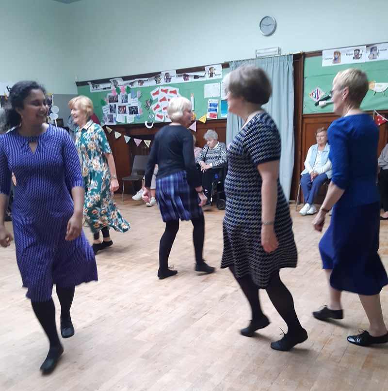 It was with great pleasure that a team of Branch dancers returned to Moments Café for a third visit. Moments is a dementia friendly group, which meets in Cathcart Trinity Church Hall twice a month. We were very warmly welcomed and as soon as Billy, our accordionist started playing, the room came alive with the ‘audience’ clapping and singing along to familiar tunes which created a great atmosphere. The programme was made up of well-known dances and included Irish Rover, Highland Rambler, Amazing Grace Strathspey, Good Hearted Glasgow, Raven’s Dance and Mairi’s Wedding.